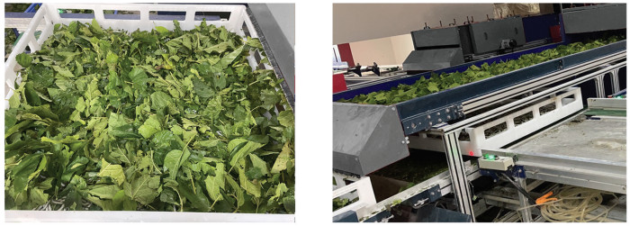 试验材料如图 7所示,所选蚕种为5龄家蚕,家蚕饲养于1 200 mm×1 200 mm×200 mm的蚕盘中,每张蚕盘的蚕体数目为1 200头。家蚕的初始状态为同一批次蚕,其生长状态基本一致,喂食的桑叶品种为农桑14号。本次试验在重庆市合川区某蚕桑基地进行。