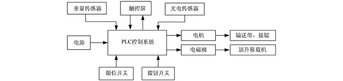 自动化养蚕装备主要通过PLC控制系统搭配各种传感器与执行器控制各机构的运转,其控制原理如图 2所示。其中触控屏可设定输送带速度值并显示装备运行时的各项参数;限位开关、重量传感器及光电传感器将蚕盘的位置信号反馈给PLC控制系统;PLC通过接收并处理来自触控屏及各传感器的输入信号,将其转化为控制指令,进而控制电机[18]、电磁阀,实现自动化养蚕作业过程。