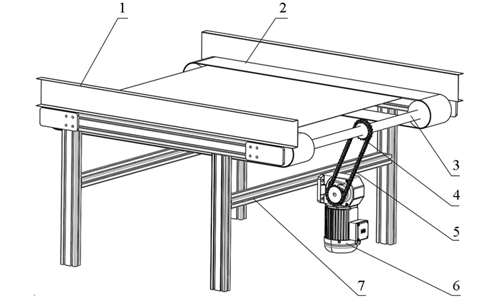 蚕盘输送机构由同步带、伺服电机、链轮、链条、主动辊[19]、挡板、机架等组成,整体结构如图 3所示。