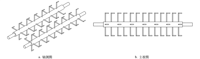由分析可知,拨桑辊的拨杆应满足在同一回转平面内对称分布,在整个带宽内均匀分布,其结构如图 5所示。采用双排拨桑辊的设计,相较于单排拨桑辊,不仅降低制造难度,同时防止单辊承受过大的冲击力,更利于拨桑均匀。前排拨桑辊轴向分布6列拨杆,后排分布7列拨杆,双排拨杆均匀错开。