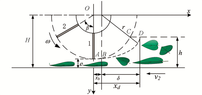 拨桑辊绕轴线旋转,桑叶随传送带直线运动,拨桑辊与桑叶的相对运动轨迹可以直观反映运动中拨杆与桑叶的接触过程,而作业过程中的相对运动轨迹与拨桑辊的结构和工作参数有关,因此需对其进行运动分析[21]。以拨桑辊旋转中心为坐标原点O,桑叶运动反方向为x轴正向,竖直向下为y轴正向,建立xOy直角坐标系,如图 6所示。图中A点和C点分别是拨杆1接触桑叶的最低点和终点,B点和D点分别是拨杆2接触桑叶的最低点和终点。拨杆1端部相对桑叶的运动轨迹方程为: