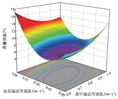 图 8为拨杆最低点离带间隙固定在中心水平时,桑叶输送带速度与蚕盘输送带速度的交互作用对质量误差的影响。当桑叶输送带速度一定时,撒桑的质量误差随蚕盘输送带速度的增加呈现先降低后升高的趋势;当蚕盘输送带速度在一定范围时,撒桑的质量误差随桑叶输送带速度的增加呈现先降低后升高的趋势。当蚕盘输送带速度过低时,将导致撒桑量增多,此时减少桑叶输送带速度会降低撒桑质量误差;当蚕盘输送带速度过高时,将导致撒桑量过少,此时增加桑叶输送带速度会降低撒桑质量误差。