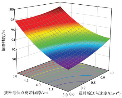 图 9为蚕盘输送带速度固定在中心水平时,桑叶输送带速度与拨杆最低点离带间隙的交互作用对饲喂精度的影响。当拨杆最低点离带间隙一定时,饲喂精度随桑叶输送带速度的增加呈现缓慢升高的趋势;当桑叶输送带速度一定时,饲喂精度随拨杆最低点离带间隙的增加呈现快速升高的趋势。