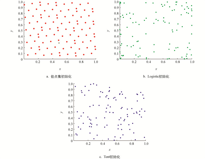 为了验证佳点集初始化的有效性,设置初始种群数量为100,在二维空间中初始化麻雀种群,与Logistic混沌映射和Tent映射进行对比,对比结果见图 1。从图 1中可以直观看出,佳点集策略初始化的麻雀种群分布更为均匀,能进一步优化算法收敛速度,避免陷入局部最优。