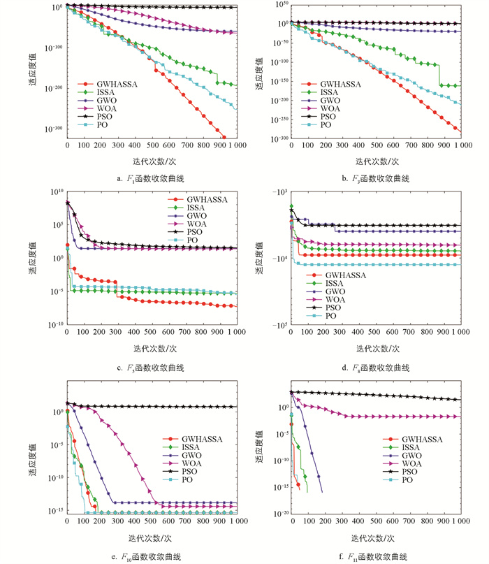 图 2为各算法收敛曲线图,GWHASSA的收敛速度和精度整体上优于WOA、PSO、GWO、ISSA及PO 5种算法。相较于之前改进的ISSA算法,本文改进过的GWHASSA算法在寻优能力和全局搜索方面都有所提高。