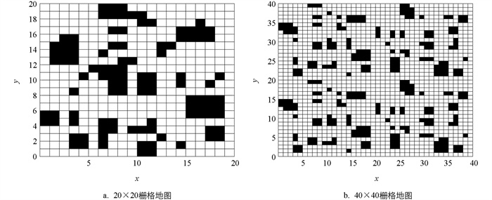 • 首先,将机器人的活动范围设置在二维平面空间内,然后使用栅格法来构建地图模型。其中,黑色的栅格表示空间中存在的障碍物,而白色的栅格则表示无障碍物可顺利通过的路径,路径规划问题的目的便是找到一条安全无碰撞并且高效的路径。为了仿真实验的顺利进行,把现实问题中不规则的障碍物全部填充满栅格。图 3便是栅格法生成的二维平面地图,其中包括障碍物较少的简单环境地图和障碍物较多的复杂环境地图。