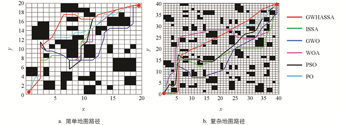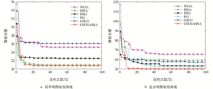表 3的实验数据能够得出GWHASSA在简单地图中与WOA和ISSA算法具有相同的最短路径,且小于GWO、PSO和PO算法的最短路径。但是就平均值而言,在30次实验中GWHASSA的平均路径长度为21.084 2,小于其他算法,在标准差方面也优于其他5种算法。而在复杂地图中GWHASSA生成的最短路径为47.073 2,平均路径长度为49.817 3,相比其他5种算法,GWHASSA都表现出一定的优势,且标准差也明显优于其他算法。实验表明,本文提出的GWHASSA有较好的稳定性和鲁棒性。