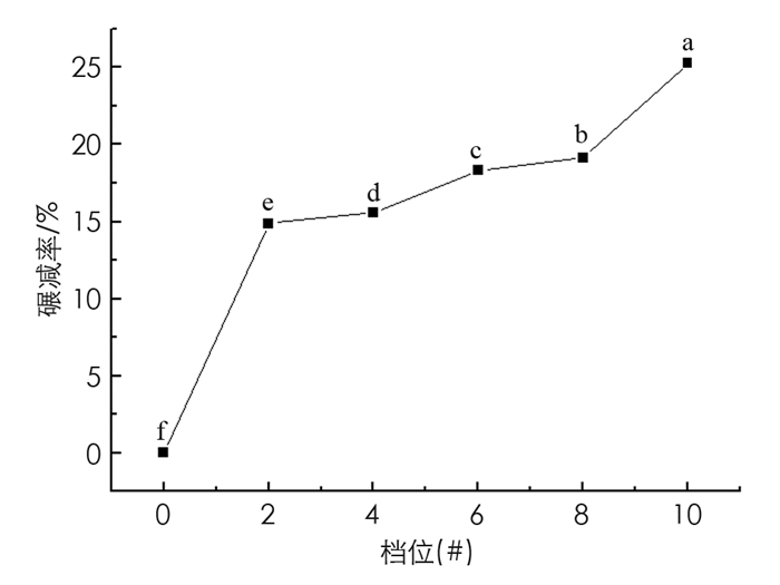 当档位调至2档时,籼米碾减率从0%快速增加到14.90%;随后平缓增加,当档位调至6档时,碾减率增加至18.32%;最后再急剧增加,当档位调至10档时,达到25.27%. 这是由于籼米从外至内为皮层、糊粉层和胚乳,这3层具有不同的受力特性. 皮层最易脱落,碾磨前期主要是皮层,当大部分皮层去除后开始碾磨糊粉层;糊粉层较皮层结合更紧密,因此碾减率缓慢增加;后期碾磨的是胚乳部分,可能是由于胚乳质量远远大于皮层和糊粉层,所以籼米的碾减率快速增加.
