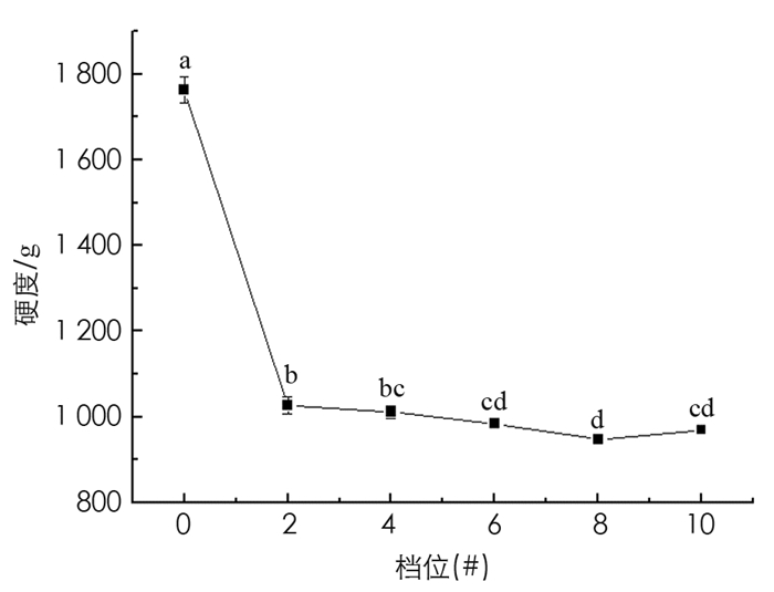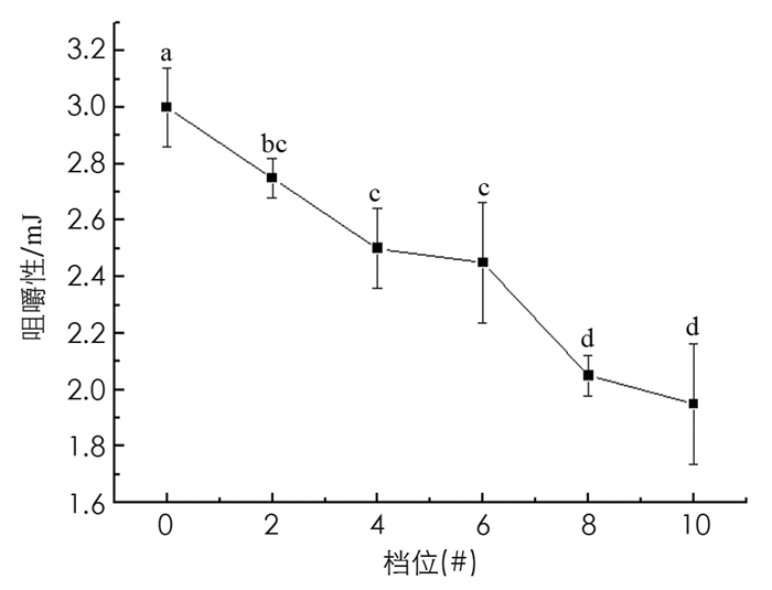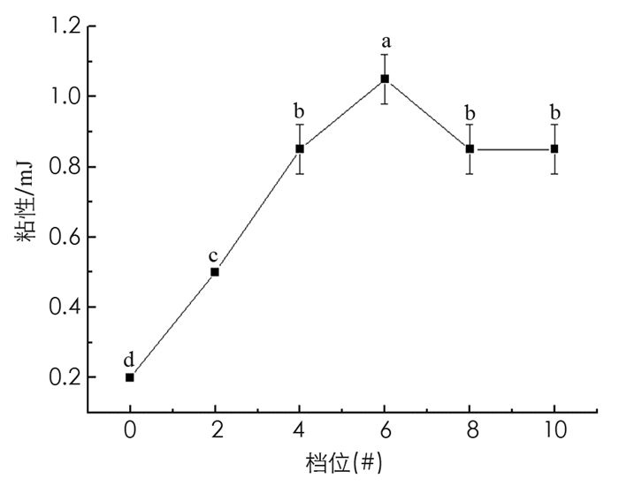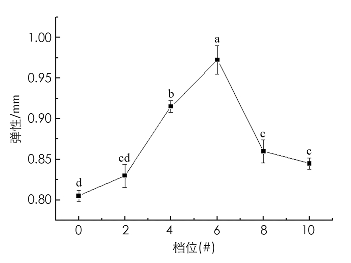 随着碾磨程度的提高,籼米的质构特性不断改善,这是由于米样的皮层、蛋白等物质不断被碾除,使得水分更容易进入,进而影响米饭的品质. 弹性是米饭食用品质中的重要指标之一,米饭的弹性越大,越有嚼劲[20]. 由图 5可知,籼米米粒的弹性在碾磨档位0-6#之间呈上升趋势,且各档位间差异有统计学意义(p<0.05);6档之后呈下降趋势并趋于平缓,这说明过度碾磨后对米饭品质有一定影响.