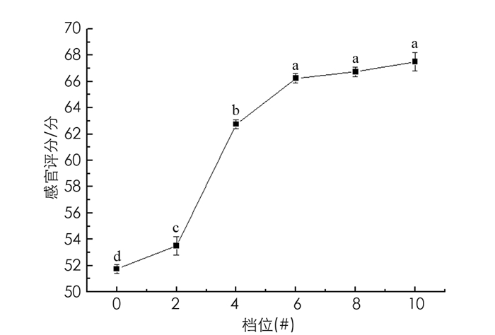 以气味、外观结构、滋味、适口性等指标来评价渝香203不同碾磨程度大米米饭的食用品质,结果见图 7. 随着碾磨程度的提高,大米米饭的感观评分呈现升高的趋势,最后趋于平稳,当档位调至10档时,感官评分为67.5分. 这可能是因为在碾磨过程中,大米的皮层不断被打磨,米饭颜色逐渐变浅,白度升高,大米外观品质不断提高,同时皮层中影响大米口感、滋味的粗纤维、蛋白等物质被除去,提高了米饭的口感和滋味. 后期可能因为大米皮层完全被碾除,皮层带给感官评分的影响已经很小而且大米的风味在此时也能够全部溢出,因此后期感官评分值变化不大[7].