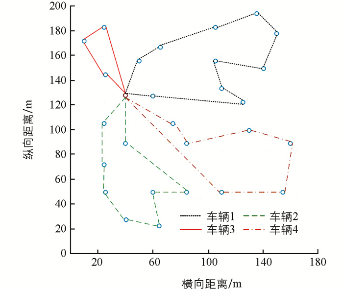 根据图 3可知,在考虑配送点位置、距离、时间窗等因素的基础上,使用4辆配送车辆通过合理的行驶速度和分工协作,遍历了所有的配送需求点,成功完成配送任务。