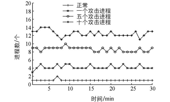 应用进程是网络通信的终点,两台网络主机间可能存在不止一个通信进程,在TCP/IP协议族中,运输层使用IP地址和协议端口号来区分主机的不同进程.通过对大量实验数据分析可知,正常的远程连接中两台主机间的通信进程数维持在一个左右,少有波动;但暴力破解攻击中,攻击者为加快攻击速度,会同时开启多个进程进行攻击;以SSH协议为例,图 1是攻击及正常通信进程数对比图.