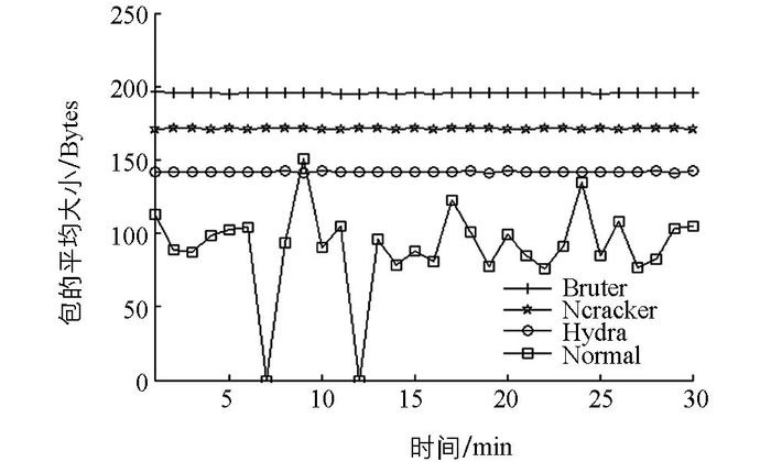 所有在因特网上传送的数据都是以分组(即IP数据报)为传送单位的,计算机将数据封装成数据包时,会在包头加入一些信息.通过分析大量的正常数据包和异常数据包包头,发现异常数据在包的平均大小和进程发包数上有很强的统计规律,而正常用户通信中不存在这种规律,可以通过统计数据包包头信息来分析是否存在统计特征作为判定暴力破解的依据.以暴力破解SSH协议为例,本文使用了Hydra,Bruter,Ncracker 3种暴力破解软件进行试验,并和正常用户数据进行对比,图 2是不同情况下数据包平均大小随时间的变化情况.