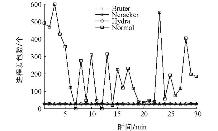 从图 2可以看出,在攻击情况下,每分钟包的平均大小会因为使用的攻击软件不同而发生变化,但是使用同一种攻击软件时数据包大小不会出现太大波动;而正常通信中,数据包的大小是随机变化的、没有统计规律,波动很大.类似地,通过大量的实验分析发现,这种特征也出现在每分钟进程平均发包数中,以暴力破解SSH为例,图 3是不同攻击情形每分钟进程的平均发包数.