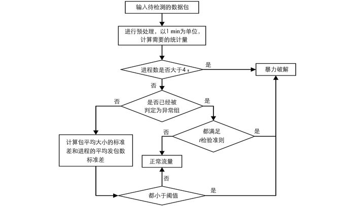 根据上述方法,采用Python语言实现暴力破解攻击的检测系统.该系统可用于发现单机暴力破解和分布式暴力破解行为.输入为pcap格式的数据包,输出为包含暴力破解行为的IP组.检测流程如图 4所示.