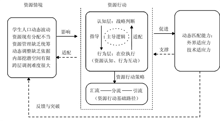2018年,《中共中央国务院关于全面深化新时代教师队伍建设改革的意见》指出,要“创新编制管理,加大教职工编制统筹配置和跨区域调整力度,省级统筹、市域调剂、以县为主,动态调配”[2]。2025年,《教育部等六部门关于印发〈县域普通高中振兴行动计划〉的通知》更明确指出,要深化“‘县管校聘’管理改革,完善教师编制、岗位资源统筹使用、动态调配的管理机制”[3]。一系列政策为地方实践开辟了空间。部分人口流入地率先作出了探索,通过挖掘闲置编制、推动教师轮岗、创新岗位设置等途径,实现了教师资源的优化配置[4]。实践表明,即使在资源受限情境中,一些地方政府也能够通过“拼凑”策略扭转劣势,将组织危机转化为发展契机,其经验值得深入探讨。本研究基于吉登斯(Anthony Giddens)的策略行为理论与资源拼凑理论构建编制困境资源统筹框架(图 1),选取某人口净流入但资源相对贫乏的县级市B市作为案例,探讨地方政府在资源约束条件下如何突破路径依赖,实现高中教师供给的动态平衡。