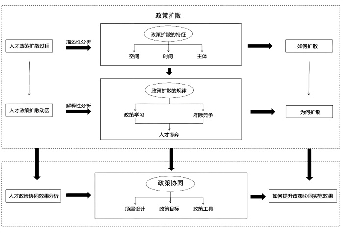总之,探讨成渝地区双城经济圈建设中两地的人才政策协同问题,就需要在描述好政策扩散的过程的同时,深挖政策扩散的内因与机制。也即主要从描述性分析与解释性分析两个维度入手,先描述人才政策在成渝两地之间相互扩散演化的过程,然后从现象表层回归内在逻辑,探究人才政策扩散形成各种样态的内在规律。基于此,本文将借助于政策扩散理论从成渝人才政策扩散过程和动因两个方面讨论成渝人才政策如何扩散、为何扩散的问题,并在此基础上对成渝两地人才政策协同实施的效果进行分析(见图 1)。