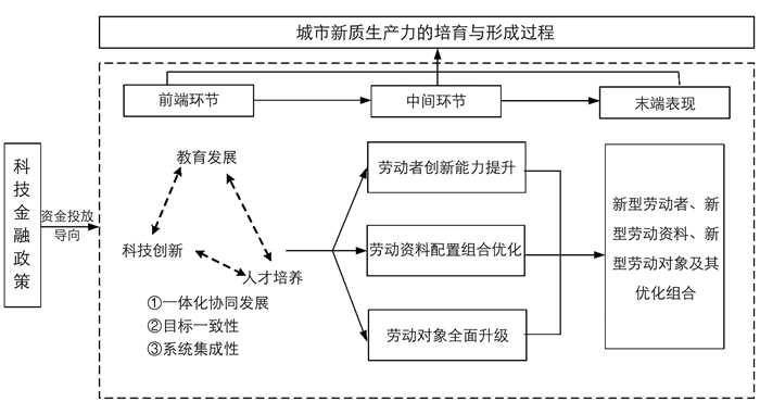 习近平总书记在二十届中共中央政治局第十一次集体学习时强调,“要按照发展新质生产力要求,畅通教育、科技、人才的良性循环”[20]。如图 1所示,城市新质生产力发展是一个长期过程,体现为涵盖前端环节、中间环节以及末端表现等环节的发展链条。这一发展链条源于“教育、科技、人才”三要素的良性循环,在发展链条的后端呈现出新的生产力形态,往往以新型劳动者、新型劳动资料、新型劳动对象及其优化组合为主要特征[21]。科技金融政策实施,通过资金支持的方向,引导教育发展、科技创新、人才培养的一体化协同发展,持续增强“教育、科技、人才”三要素的目标一致性和系统集成性[22],掌握新型劳动资料的创新型人才不断涌现,新型劳动者重新配置组合新型劳动对象,新型生产关系加快重塑,逐步形成“教育、科技、人才”良性循环促进城市新质生产力发展的新格局[23]。