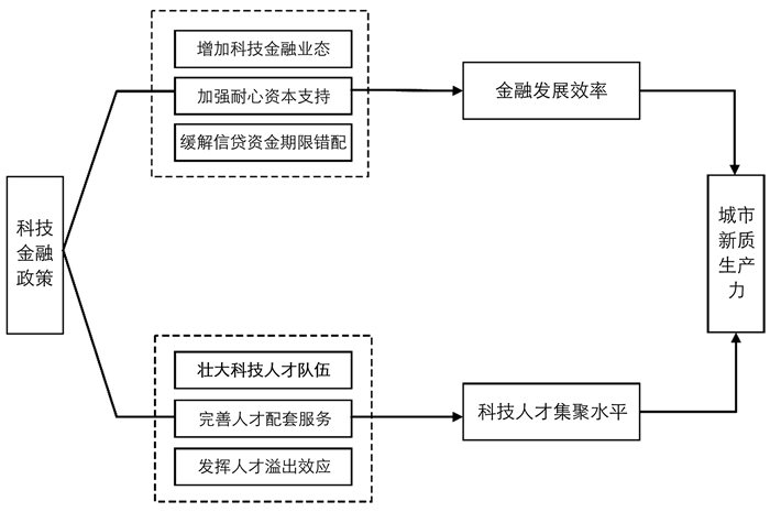 资本和人才是促进科技进步的两大关键要素。如图 2所示,科技金融政策实施,能够通过对金融发展效率和科技人才集聚水平的提升,实现对科技创新的推动作用,进而促进城市新质生产力发展。