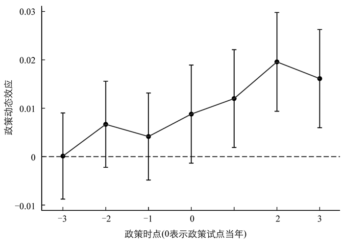 平行趋势检验结果如图 3所示。可以发现,在试点政策实施之前,实验组和对照组城市新质生产力水平的变化趋势并没有显著差异,此时存在平行趋势;在政策实施之后,实验组和对照组城市新质生产力水平的变化趋势之间的差异越来越明显,试点政策对城市新质生产力的促进作用不断增强,实验组和对照组之间的差距逐步扩大。这一结果说明双重差分模型要求的平行趋势假设成立。