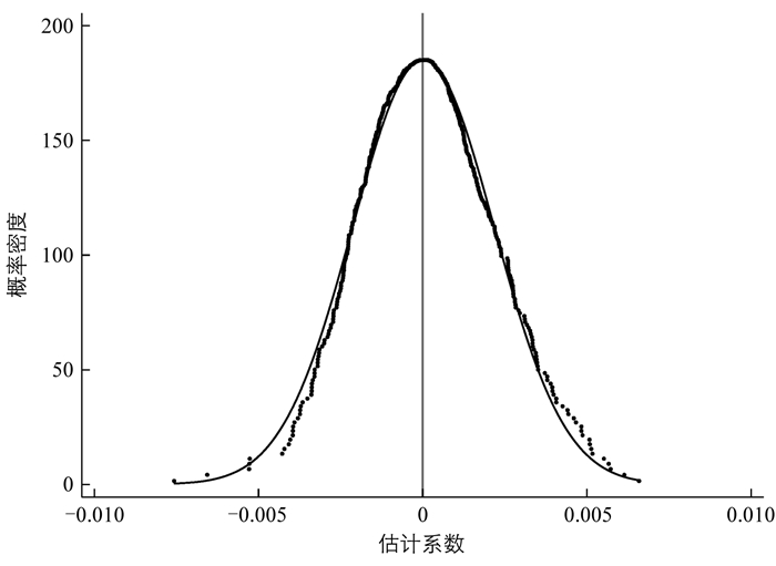 重新设置试点政策实施的实验组和对照组,将所有试点城市随机分配到实验组和对照组中,按照试点政策实施的时间节点设置时间虚拟变量,随机抽样重复500次,并绘制安慰剂检验结果图。如图 4所示,试点政策变量的系数估计值分布在0附近且近似于正态分布,表明不可观测因素不会对基准回归结果产生显著影响,试点政策对城市新质生产力的影响作用是真实有效的。