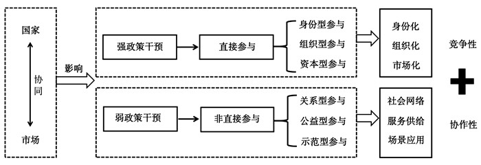 区别于欧洲崛起中的国家力量,“东亚发展的最重要的特征是国家和市场的协同作用或‘被引导的市场’”[24],而非纯粹以国家为中心或以市场为中心。在这种协同格局中,可以依据政策干预的强弱程度,将民营企业参与国家重大项目建设的类型概括为直接参与和非直接参与(如图 1所示)。直接参与是民营企业在政策、法律及规划的明确框架下直接进入重大项目体系,进行竞争性资源配置[25];非直接参与体现为民营企业通过间接投资、区域项目融入等路径嵌入国家战略布局,进行协作性资源配置。两种参与形式相辅相成,奠定了民营企业参与国家重大项目建设的实践基础。