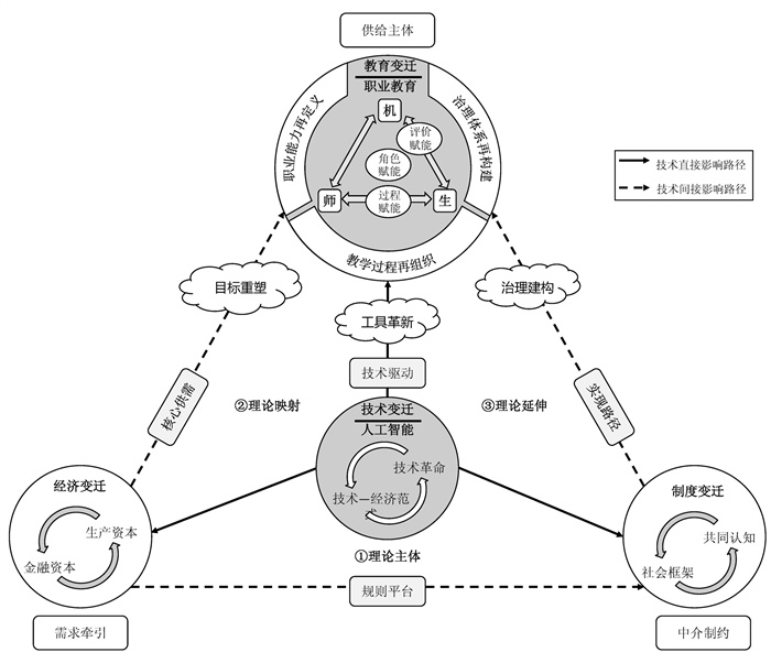 • 人工智能具备的特性、功能及其用户与系统的交互模式[10]正深刻影响着教育领域,而职业教育所具有的独特类型属性拓宽了技术变革对其影响的生成路径[11],这种倒逼效应既包括直接性的,也包括间接性的。从技术—经济范式看,直接影响是指人工智能作为一种技术手段直接作用于职业教育发展,即人工智能所带来的教育生态重塑使职业教育产生工具性革新;间接影响体现在两个方面,一是人工智能技术变革下的经济生态演进与劳动世界发生的巨大变革,二是技术进步所促进的社会需求成长[9]196。归根结底,人工智能赋能职业教育的价值生成就是要回答为什么职业教育必须改变的问题,也就是明确人工智能作为技术驱动力,如何促成作为需求方的经济、作为供给方的职业教育以及作为中介和制约方的社会框架发挥效力的关键逻辑。