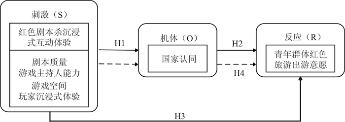 • 诸多研究表明,沉浸式体验会使体验者获得高度的愉悦感和充实感[24],在体验结束后仍留下深刻印象,也会对游客出行意愿与行为产生影响[25]。在“剧本杀”营造的逼真场景的沉浸式体验过程中,人与人、人与物、人与环境交互与互动[5],身临其境的在地感和体验感被不断强化,进而增强了国家认同意识,而这种国家认同感与红色旅游内涵同频共振,由此青年群体被红色实景旅游吸引,产生出游意愿。此外,结合SOR理论,“红色剧本杀”作为一种沉浸式体验游戏,剧本内容、游戏主持人和游戏空间都能够在视觉、听觉上对游戏玩家产生刺激,从而使其产生情绪变化,本研究将这种情绪变化定义为国家认同感。国家认同感将增强青年群体对红色旅游目的地的出游意愿,即“红色剧本杀”这一外部刺激的结果最终体现为青年出游意愿。基于此,提出假设H3和H4:
