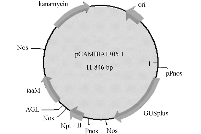 本实验使用的农杆菌菌株为EHA105,由国家948项目引进.质粒为pCAMBIA 1305.1,转化所用载体结构为pPnos-GUSplus-Nos-Pnos-NptII-Nos-AGL-iaaM-Nos,该载体包含标记基因NptII及GUS基因,该质粒质谱图如图 1所示.