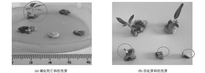 将抗性芽剪下接入Kan培养基中进一步筛选,30 d左右有64株外植体出现白化现象(图 4(a)),又除去农杆菌污染的34株,最终获得转化子70株(图 4(b)).