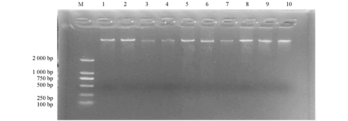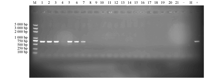 对分化出抗性苗的70株植株提取DNA,以野生型诺丽DNA为对照,将提取的诺丽DNA通过琼脂糖凝胶检测.结果显示DNA条带较为清晰,明亮,无明显拖尾现象(图 5),说明提取的DNA质量较好,浓度较高,并且在此过程中无DNA被降解现象,可用于后续PCR实验.以NptII作为标记基因的PCR检测,发现转基因植株可扩增得到750 bp的特异性扩增产物,阴性对照没有获得特异性扩增产物(图 6).将扩增出的条带进行测序,测序结果显示目的基因即为NptII基因片段.本实验通过PCR共检测到为阳性的转化子9株,转化率为5.4%.