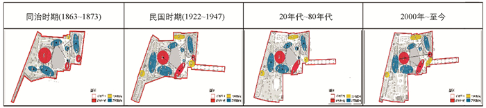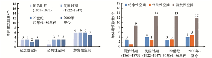 • 水系周边建筑空间布局经游赏性空间对列交错、纪念性空间沿岸排布、游赏性空间核心主导、纪念性空间轴线贯穿4个阶段,水系周边建筑功能经纪念性与游赏性共存、纪念性与游赏性增强、纪念性弱化、纪念性恢复的变化,使得东湖从以酬唱游宴为主的衙署园林变为以纪念为主的公共园林.从图 10图 11可知,同治时期纪念性空间数量为3,公共性空间数量为1,游赏性空间个数为6,其空间分布呈对列交错的状态,游赏性建筑数量为9,游赏功能占主导性,而公共性与纪念性建筑数量较少,但纪念性建筑在此时期得到扩建,因此建筑的纪念性与游赏性功能都各自占有;民国时期,游赏性空间个数不变,公共性空间数量增至为3,纪念性空间数量虽然维持不变,但其空间范围变大,在岸边排列分布,而3种类型的建筑均有增加,但仍是纪念性与游赏性功能占主导,并且其功能也相应得到加强;20世纪50~80年代,公共性空间个数不变,纪念性空间数量减少1个,游赏性空间数量维持不变,其空间范围较之前拓展,处于核心主导的状态,公共性与游赏性的建筑数量没有变化,而纪念性建筑数量减少1个,建筑的纪念性因而弱化;至现阶段,公共性空间个数仍为3个,游赏性空间数量减少1个,纪念性空间数量增至3个,其分布沿轴线贯穿,游赏性建筑数量减为12,公共性与纪念性建筑数量有所增加,纪念性功能又重新得到恢复.