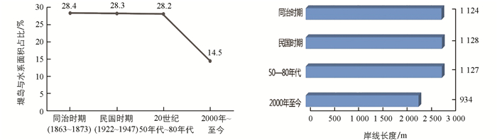 图 13  东湖堤岛与水系面积占比与岸线长度变化图