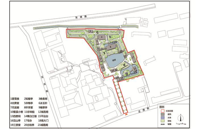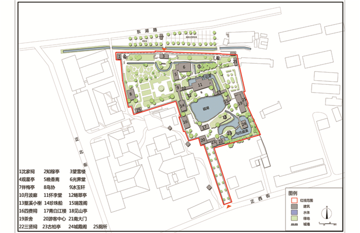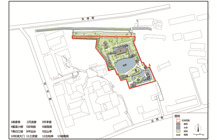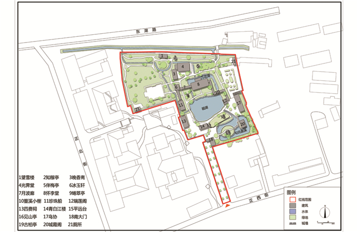 从20世纪80年代东湖水系改绘图(图 7)和东湖现状图(图 8)对比看出,现在的东湖园林除在东西两侧绿地的形态与功能有所改变、在北侧城墙望雪楼新增入口与停车场,除睠翠亭右侧水溪与冰玉轩左侧水溪消失外,其余水体的形态与规模面积都无太大变化,水系经过精简,最终形成“一渠三岛三湖三溪”的水系格局;三贤堂得到重建,园林的纪念对象重新恢复,以怀李堂为主体,在其西南侧、南侧各有四费祠与三贤堂,使得东湖对名臣与乡贤的纪念性重归完整;东湖因水源水质恶化,园林受到严重影响,后经政府对东湖水系的生态修复与净化,调整水源补水,重获新生,水从园外锦水河分支(南二支)与水井导入,自西向东流,经地下暗管流至珍珠船,再经砚湖、盘溪、万花湖,最后从园内城墙东头由管道导入南二支,形成了水体萦绕曲折,空间开合有致的水体体系.