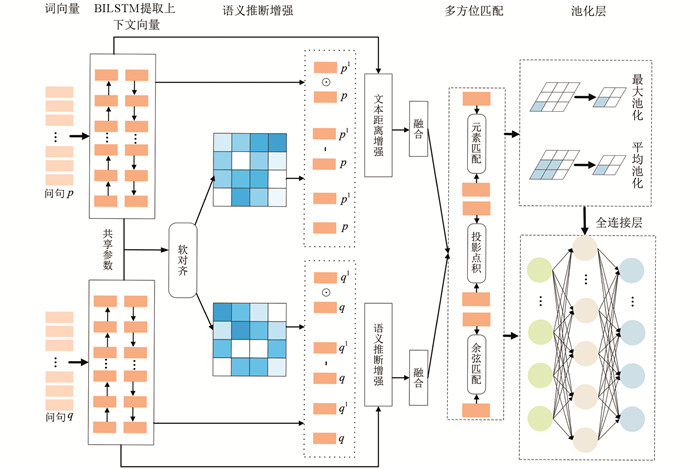 $\widetilde{q_i} $ 是pj的权重和,即qj中与pi相关的内容被抽出,用$\widetilde{p_i} $ 表示,$\widetilde{q_j}$ 同理.农业问句文本中存在“蕴含”“矛盾”“中性”等多种关系,“蕴含”指句子p能推断出句子q,例如“玉米栽培技术要点是什么”推断出“我想学习玉米栽培技术”. “矛盾”指句子p能推断出句子q的否定,例如“红薯的主要病害有哪些”与“红薯的形态特征是什么”互为否定. “中性”为其他所有情况. 对于农业文本数据的稀疏性,传统自然语言匹配方法很难推理得到文本的多种关系和相关语义. 通过pi和