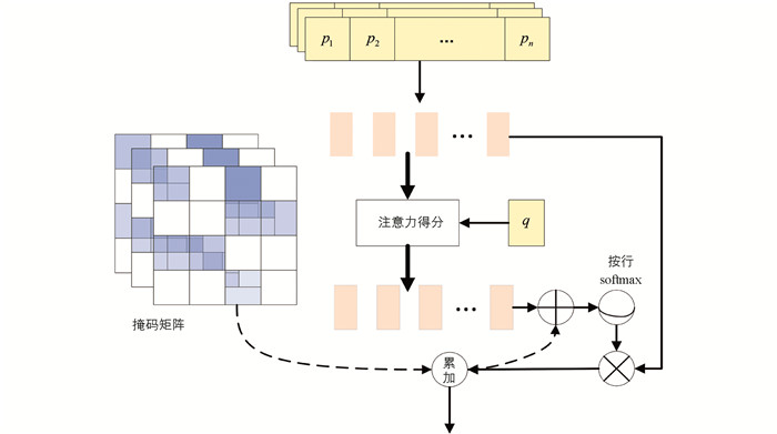 农业问句文本中词间的距离能代表其相关性,引入距离感知掩码使相近词获得更多关注,距离更远的词关注更少. 计算相似度时词间距离越远所加负数越小,经过softmax函数后,距离越远的词权重越小,词间的依赖也随之削弱. 在公式(6)中加上掩码M,M维度为1×1,矩阵中的值在{0,-∞}之间,由此构建适用农业问句文本函数(7):