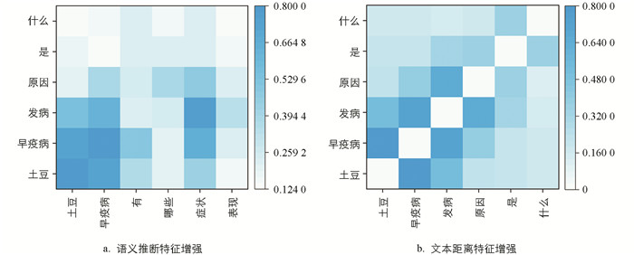 图 3为来自农业文本数据集的一个实例的注意力权重热力图,问句1为“土豆早疫病有哪些症状表现?”,问句2为“土豆早疫病发病原因是什么?”. 图 3a是两个句子自注意力的对齐情况,其中“土豆-土豆”,“早疫病-早疫病”,“症状-发病”有很强的对齐关系,这些为句子关键词,可明确表示句子语义,通过捕捉两句话对齐关系可一定程度上判断词间关系. 图 3b是同一问句注意力权重的可视化结果,可以看出距离更近的词间注意力权重更大,融合语义推断特征和文本距离特征进一步捕获句子的语义对齐信息,获取丰富的交互信息,提升语义匹配任务的性能.