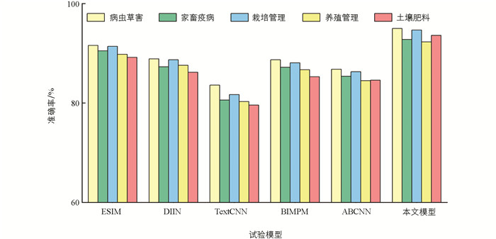 如图 4,与ESIM,DIIN,ABCNN,BIMPM,TextCNN 5种文本匹配模型相比,本文模型在病虫草害、家畜疫病、栽培管理、养殖管理、土壤肥料5个类别的问句数据集上均有最高的匹配准确率,整体匹配效果优于对比匹配模型. 在病虫草害和栽培管理两个试验数据量充足的类别上准确率率为95.0%和94.7%,因为数据集越充分,对深度学习模型迭代训练的效果提升越高. 在养殖管理和土壤肥料两个数据量较少的类别中也高于其他模型的精确率,说明本文模型鲁棒性较强,在数据量不充足时也能有效提取文本特征进行相似度匹配.