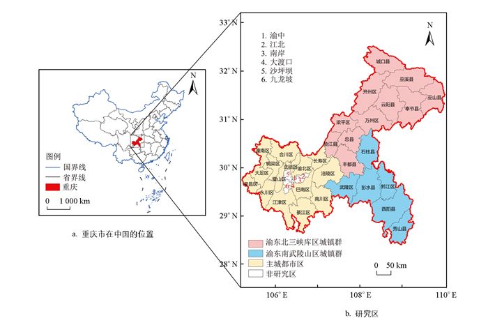 • 研究区域概况如图 1所示。本文以重庆市32个区(县)为空间研究单元(渝中区、大渡口区、江北区、沙坪坝区、九龙坡区和南岸区的城镇化率达到或接近100%,不纳入研究范围),其内部行政单元间经济发展水平存在明显差异,区域二元结构特征显著。以中心城区为核心的西部地区经济社会发展较为成熟,东部山区发展则相对滞后。为促进区域协调发展,重庆市提出构筑以主城都市区为引领,联动渝东北三峡库区城镇群和渝东南武陵山区城镇群的“一区两群”协调发展格局,旨在推动三大区域优势互补、互促共进。需要指出的是,垫江县于2024年3月正式划入重庆主城都市区范围,但在本文研究的时间范围内(2010-2023年),垫江县仍被归类为渝东北三峡库区城镇群,故垫江县在本文中纳入渝东北三峡库区城镇群进行分析。