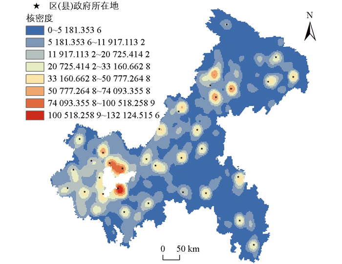 图 2  2023年重庆市乡村生产性服务业兴趣点(POI)核密度