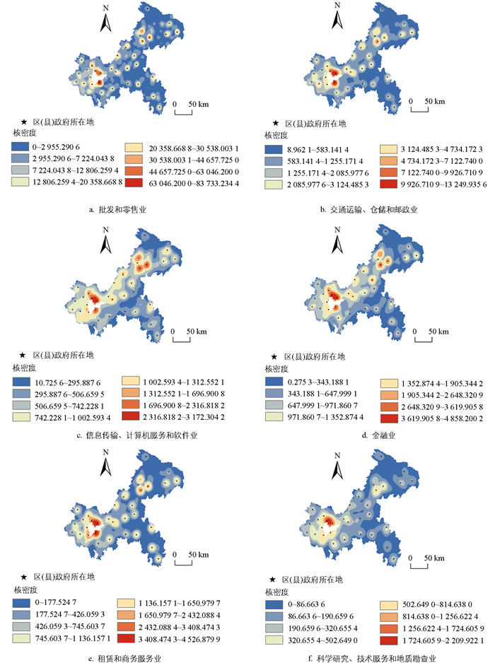 图 3  2023年重庆市乡村生产性服务业各细分行业兴趣点(POI)核密度