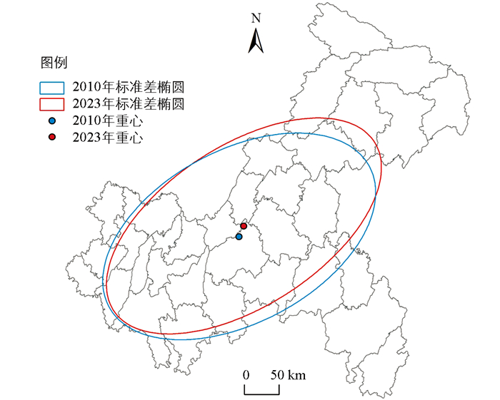 图 4  2010年、2023年重庆市乡村生产性服务业地理分布标准差椭圆