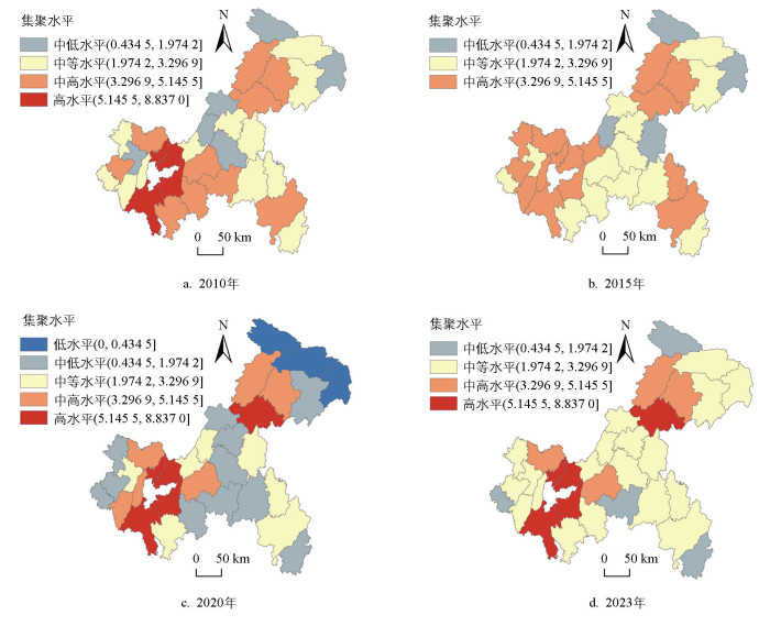 • 2010、2015、2020和2023年4个时间节点重庆市32个区(县)乡村生产性服务业集聚水平均值时序演化特征如图 5所示。本文根据产业平均地理集聚率计算公式对2010、2015、2020和2023年4个时间节点重庆市32个区(县)乡村生产性服务业集聚水平均值进行测算,并计算分区域均值。采用自然断点法[41],以2020年为例,将乡村生产性服务业集聚水平由低到高分为低水平(0,0.434 5]、中低水平(0.434 5,1.974 2]、中等水平(1.974 2,3.296 9]、中高水平(3.296 9,5.145 5]、高水平(5.145 5,8.837 0]5个等级,同时应用于其他年份。