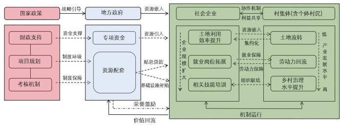 • 在村企合作赋能乡村产业发展的进程中,宏观层面的政策引导与微观层面的制度创新形成了系统联动,共同促使乡村产业在经济、社会及生态等多个维度实现综合效益[33-34]。国家政策通过财政支持、项目规划及绩效考核机制等战略手段,向地方政府提供资金与制度环境支撑,促使地方政府根据本地区自然与人文禀赋因地制宜地开展具有当地特色的村企合作模式。在实际运行过程中,企业通过资金投入、土地流转、就业岗位提供和技能培训等路径,推动农村资源要素的有效重组与整合。一方面,土地集中流转显著提高了土地利用效率,农户从土地流转中获得了稳定的财产性收入;另一方面,企业创造的多元就业机会有效缓解了农村劳动力外流现象,农户在企业就业后工资性收入显著增加。通过技能培训,农户技能水平与组织化程度进一步提升,乡村治理结构也随之得到改善。