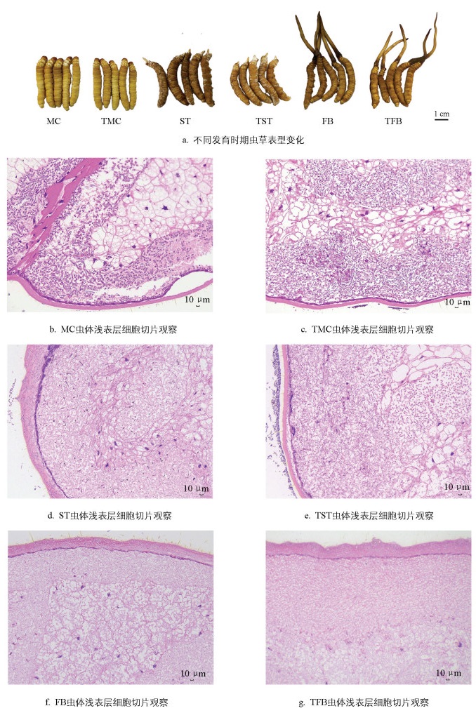 • 取不同发育时期样本[5龄感菌虫(MC、TMC)、僵虫(ST、TST)、子座长度0~1 cm冬虫夏草(FB、TFB)]于2%戊二醛固定液中固定24 h,经梯度酒精(70%、75%、85%、90%和100%酒精各30 min)脱水,再放入酒精与二甲苯混合液(体积比1∶1)中浸泡15 min,随后放入二甲苯中浸泡30 min。待样品完全透明后,将其放入二甲苯与石蜡混合液中浸泡10 min,最后放入软蜡和硬蜡中各30 min,冷却凝固。将石蜡包埋的样品经石蜡切片机进行切片,每个组织切片厚度为5~7 μm,放于载玻片制片,37 ℃过夜烤片,HE染色,树胶封片,光学显微镜下观察样品的组织细胞学结构并拍照。