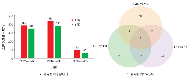 • 差异表达基因筛选结果如图 3,由柱状图、差异表达韦恩(Venn)图展示差异基因数目,TMC-vs-MC共有733个基因表达量发生了显著变化,其中上调表达的基因有385个,下调表达的基因有348个;TST-vs-ST共有815个基因表达量发生了显著变化,其中上调表达的基因有435个,下调表达的基因有380个;TFB-vs-FB共有158个基因表达量发生了显著变化,其中上调表达的基因有95个,下调表达的基因有63个。在这些基因中,总共有162个基因持续地发生显著变化。由此表明,采用精氨酸处理前期虫草,对其生长发育的影响较大;后期采用精氨酸处理,差异表达基因数量显著减少,表明精氨酸对虫草生长发育后期影响较小。