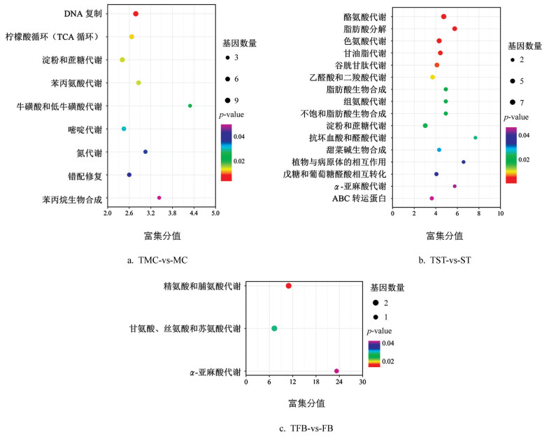 • KEGG富集分析发现(图 4),这些差异表达基因主要富集在酪氨酸代谢通路(Tyrosine metabolism,ko00350)、精氨酸和脯氨酸代谢通路(Arginine and proline metabolism,ko00330)、DNA复制(DNA replication,ko03030)、色氨酸代谢通路(Tryptophan metabolism,ko00380)、苯丙氨酸代谢通路(Phenylalanine metabolism,ko00360)、苯丙烷生物合成通路(Phenylpropanoid biosynthesis,ko00940)上。