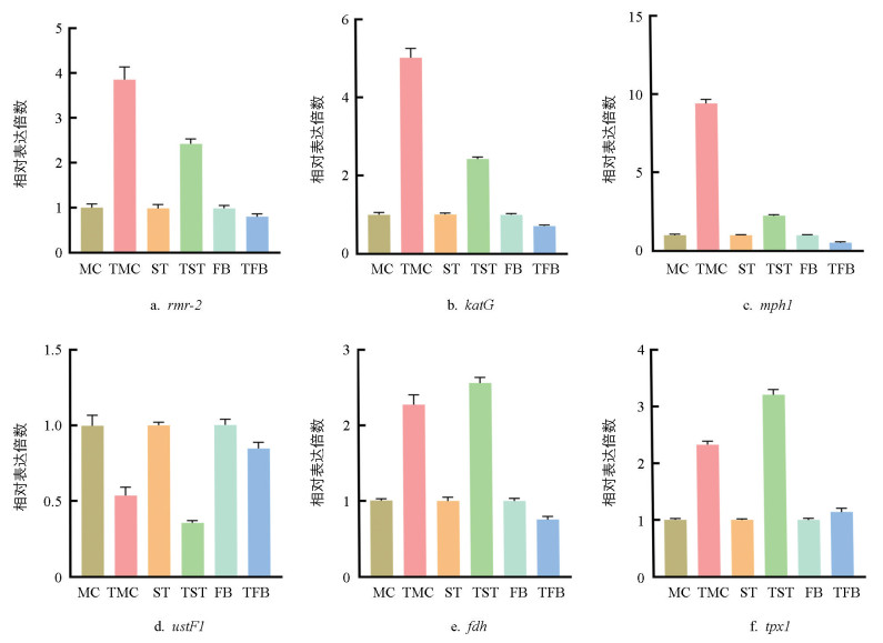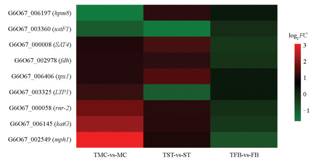 • 昆虫和食药用菌颜色变化主要由过氧化物酶、酚氧化酶、活性氧、黑化反应等调控[20-22]。由图 5可知,丝/苏氨酸蛋白激酶G6O67_002549(Serine/threonine-protein kinase,mph1),过氧化氢酶G6O67_006145(Catalase-peroxidase,katG),核糖核苷二磷酸还原酶G6O67_000058(Ribonucleoside-diphosphate reductase,rnr-2),丝/苏氨酸蛋白激酶G6O67_000008(Serine/threonine-protein kinase,SAT4),甲酸脱氢酶G6O67_002978(Formate dehydrogenase,fdh)在TMC-vs-MC和TST-vs-ST中表达显著上调,在TFB-vs-FB中表达下调;在整个发育周期G6O67_003360(ustF1)均表达下调。其中,有3个差异表达基因能显著富集到KEGG通路中,分别是过氧化氢酶katG、核糖核苷二磷酸还原酶rnr-2、甲酸脱氢酶fdh。值得关注的是,过氧化氢酶katG表达变化趋势与CAT酶活性变化相一致。