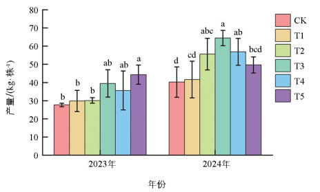 由表 2可知,2024年各处理大果型(L级和XL级)级别分布频率以T3、T5、T4处理相对较高,均显著高于CK处理;各处理M级中型果分布频率以T2、T3、T4、T5处理较高,显著高于T1处理;各处理S级小型果分布频率以CK、T1处理显著高于其他处理。