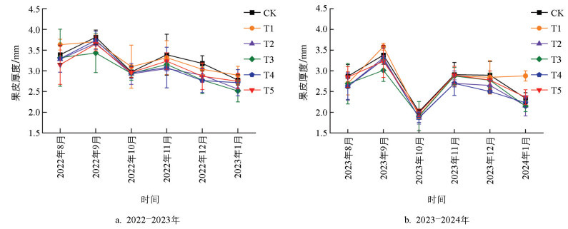 从8月至翌年1月沃柑果皮厚度检测结果表明(图 2),两年试验的动态变化规律一致,即随着时间的推移,呈先增加后降低再增加最后缓慢降低的趋势。2023年1月采收时,T3处理的果皮厚度最薄,为2.51 mm;T1处理最厚,为2.89 mm;但各处理差异均不显著。2024年1月采收时,T3处理果皮厚度最薄,为2.15 mm;T1处理最厚,为2.88 mm;T3处理的果皮厚度比T1降低了25.3%,且两个处理间差异显著。
